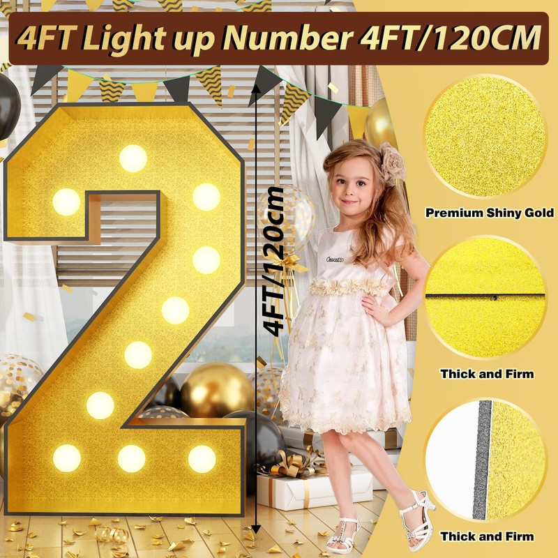 4FT Marquee 2 Numbers, Light Up Numbers 2 Mosaic Numbers Glitter Gold Black Light Up Letter Pre-Cut Foam Board Sign Marquee for Birthday Party Decorations, Wedding, DIY Anniversaries