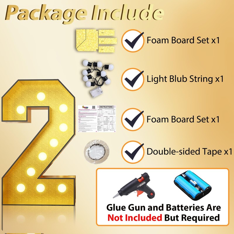 - Package Contents: The marquee 2 number set includes everything you need to create a stunning focal point for your party. Inside the kit, you'll find a detailed instruction manual, double-sided adhesive tape, a string of warm light bulbs, and a pre-cut foam board shaped as the number 5. Note that batteries are not included.