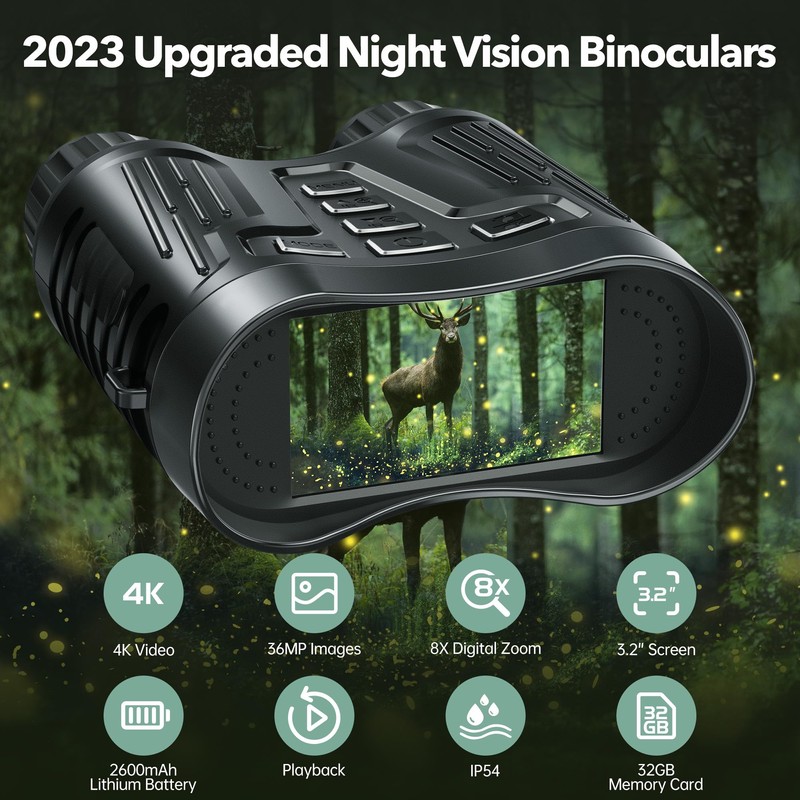 • 【4K Night Vision Binoculars】Capture the world with night vision goggles, capable of recording UHD 4K videos with sound and snapping sharp 36MP images in the daytime, low light or nighttime, also support playback function. With 8X digital zoom and 7 IR illuminator levels, these night vision binocular offers superior visibility and clarity.