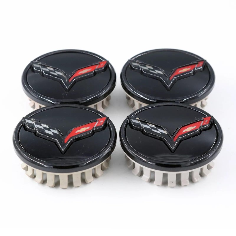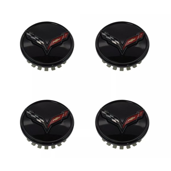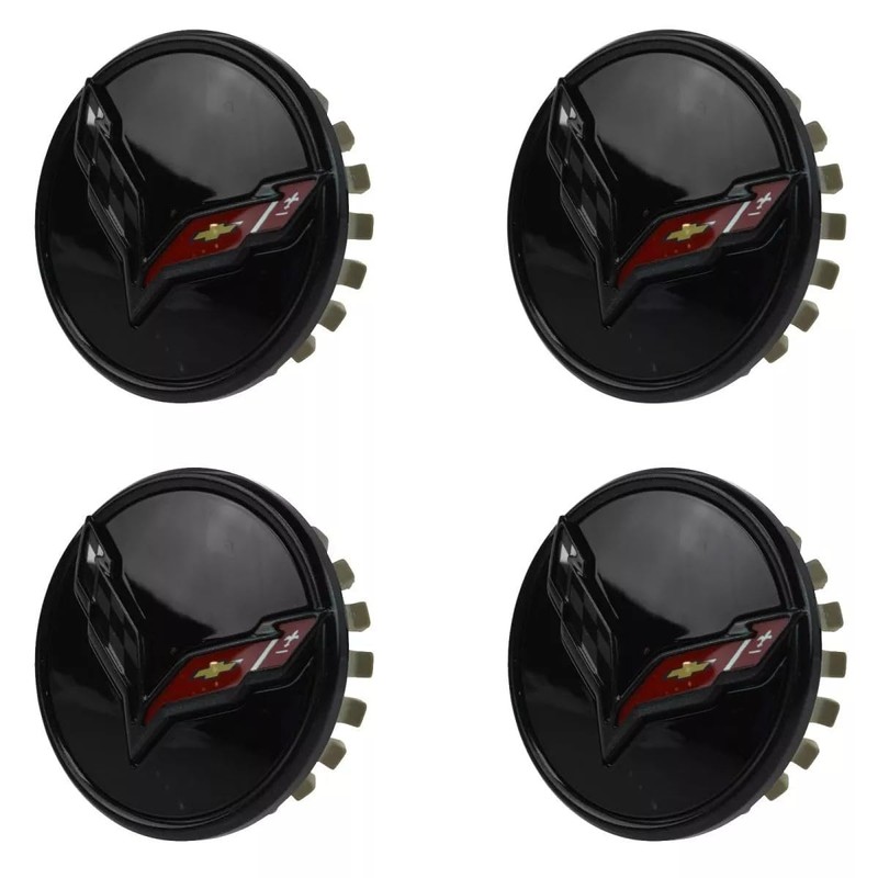 4Pc 2014+ C7 Corvette Stingray Center Caps w/Crossed Flag Logo Trim Set 23217059 (Black)