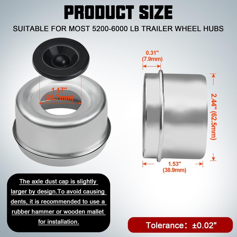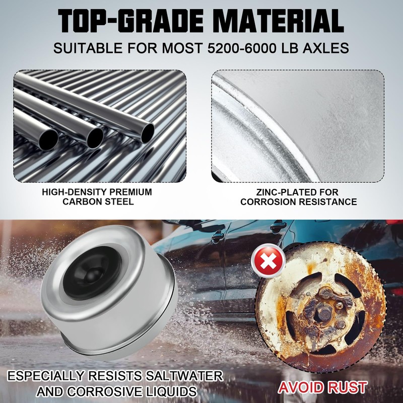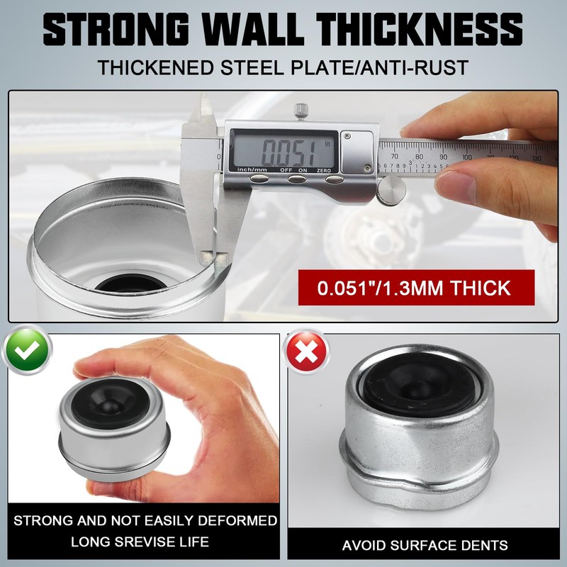 - 【Heavy Duty Materials】:This trailer dust cover kit is made of high-quality carbon steel and rubber. The metal dust cap are sturdy, resistant to deformation, and feature a galvanized surface for corrosion and rust resistance. The matching grease rubber plug is compatible with a metal dust cup, effectively preventing grease leakage and extending the use time.