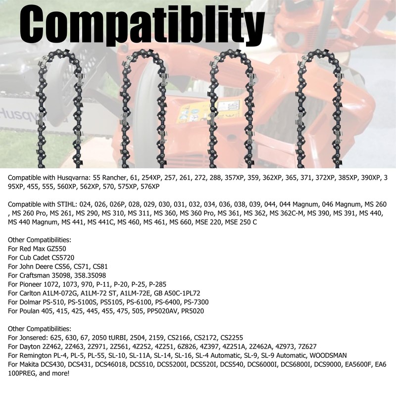 - Compatibility: 20 inch chainsaw chain Compatible with Husqvarna: 55 Rancher, 61, 254XP, 257, 261, 272, 288, 357XP, 359, 362XP, 365, 371, 372XP, 385XP, 390XP, 395XP, 455, 555, 560XP, 562xp, 570, 575xp, 576xp