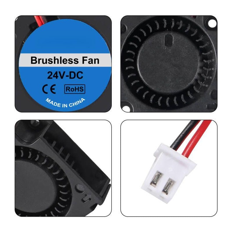 - 30mm x 30mm x 10mm Fan rated voltage: DC 24V, Current: 0.06A, Speed: 7000PRM, Airflow: 1.75CFM, Noise: 28dBA