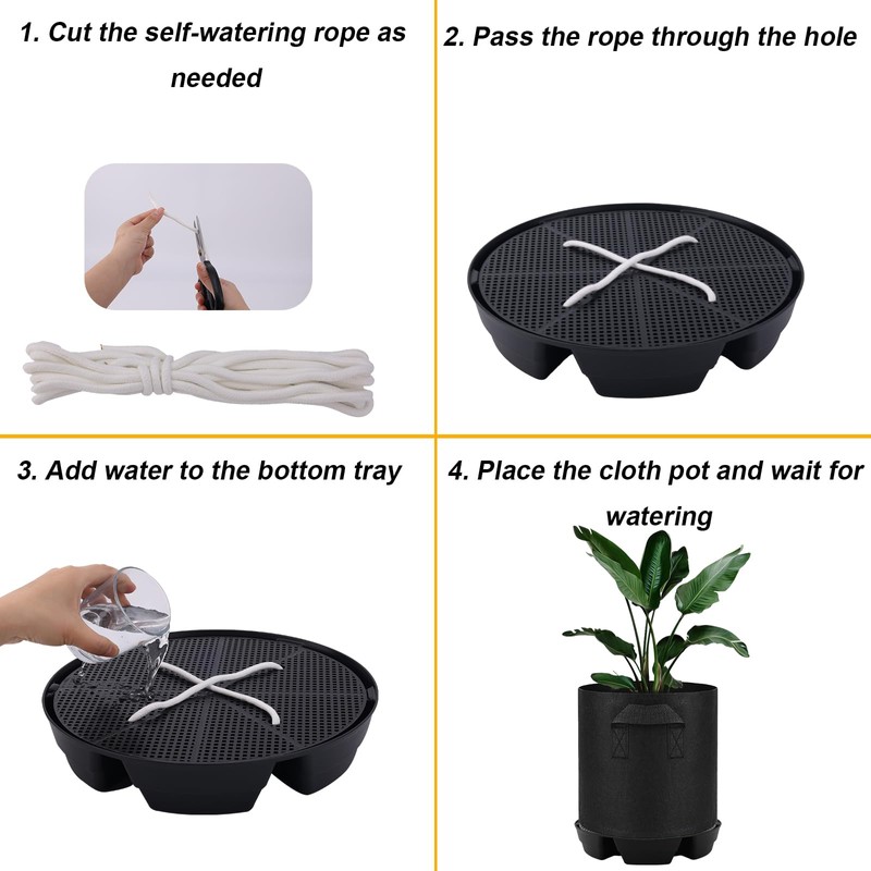- Easy to Use: First, cut the self-watering rope to the required length and thread it through the hole, add water to the tray at the bottom. Then, place the fabric pot and wait for the self-watering system to start working.
