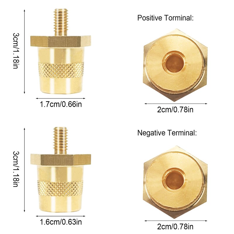 • 【Package Included】2X Brass Negative Extender Bolt Terminal; 2X Brass Positive Extender Bolt Terminal.