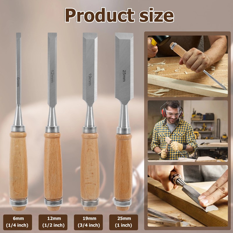 [Size & Package] The package includes 4pcs wood chisels in different sizes, including 6mm (1/4 inch), 12mm (1/2 inch), 19mm (3/4 inch), 25mm (1 inch). Different sizes can meet your various engraving needs, perfect for your woodworking whether you are a professional carpenter or a beginner.