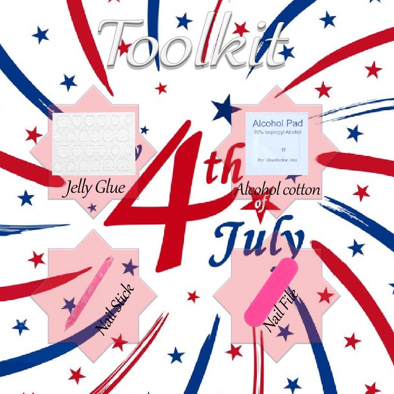 - Packaging: 24pcs 4th of july press on nails, 1mini nail file, 1pack of alcohol cotton, 1piece (24 pieces) jelly glue, 1nail art stick. (Glitter is easy to fall off, please apply an extra layer of protective glue,Packaging does not contain glue.)
