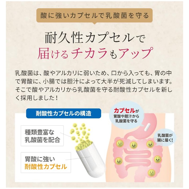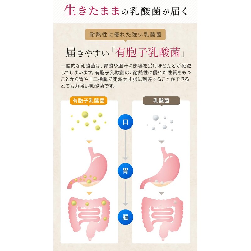 • 【乳酸菌を腸に到達させる】摂った乳酸菌を腸までしっかり到達させるための2つの工夫。《有胞子乳酸菌》胃酸や胆汁にも負けない強さを持った乳酸菌で胃や十二指腸で死滅せずに腸まで到達します。《耐酸性カプセル》乳酸菌を胃酸や胆汁から守ってくれるカプセルを採用し腸まで到達することをサポートします。