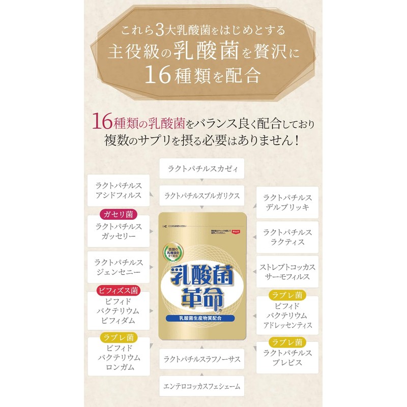 主原料はTVでも話題の「酪酸(乳酸菌生産物質)」3大乳酸菌「ビフィズス菌」「ラブレ菌」「ガセリ菌」をはじめ、厳選された16種3兆個の乳酸菌を1袋にギュッと配合した乳酸菌サプリメントです