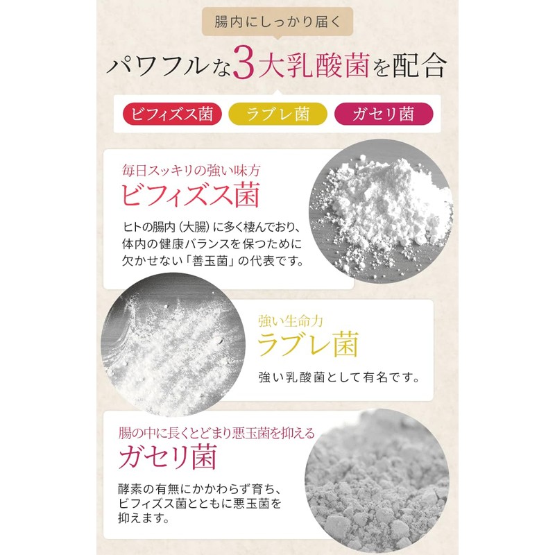 • 【1袋で16種3兆個の乳酸菌が摂れる】3大乳酸菌「ビフィズス菌」「ラブレ菌」「ガセリ菌」をはじめ、厳選された16種3兆個の乳酸菌を1袋にギュッと配合。1日あたり1,000億個以上(目安)の乳酸菌を摂取できるように設計されています。