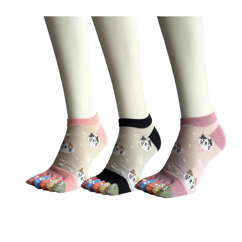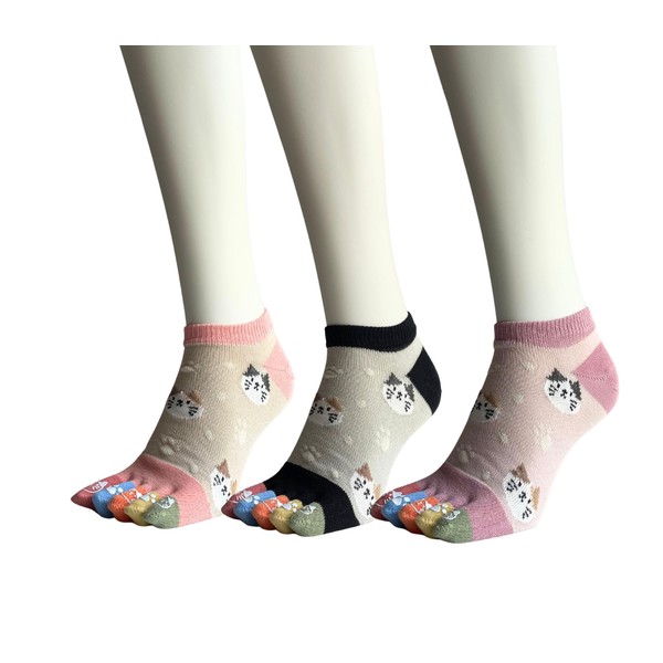 [モードセレクト] 5本指ソックス レディース 夏 薄手 5本指靴下 レディース 猫柄 くるぶし 夏 可愛い おしゃれ 通気性 表糸綿100% 3足セット(色お任せ) P09