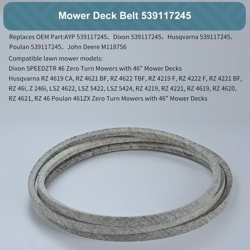 - Replaces OEM AYP 539117245, Dixon 539117245, Husqvarna 539117245, Poulan 539117245, John Deere M118756. Length: 123 inch, Width: 0.625 inch.