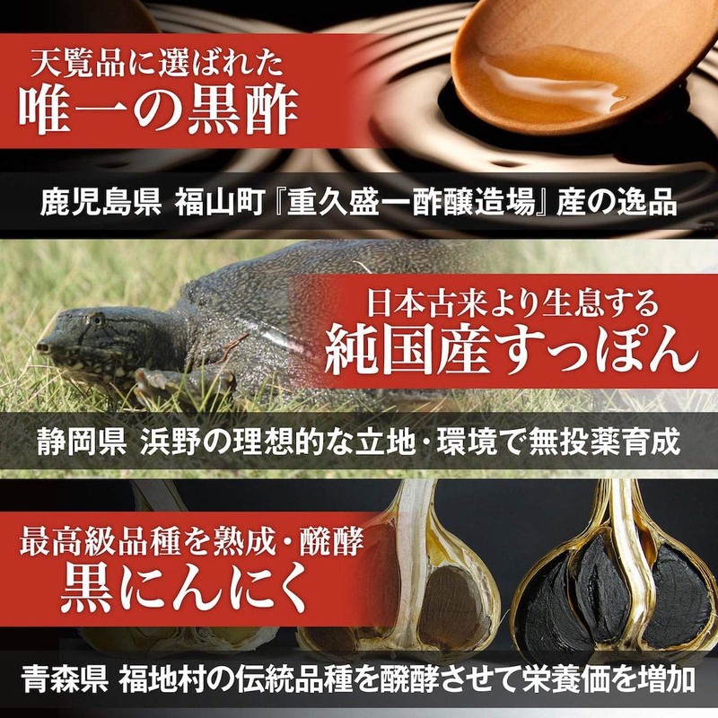 - ✅【こだわりの黒酢:鹿児島県】天皇・皇后両陛下の行幸啓において、天覧目録12号に輝いた唯一の黒酢(福山町の老舗『重久盛一酢醸造場』産)。さらに黒酢の甕(かめ)の底で凝縮された栄養成分・もろみも配合。一般的な黒酢の約10倍のアミノ酸を手軽に摂取できます。