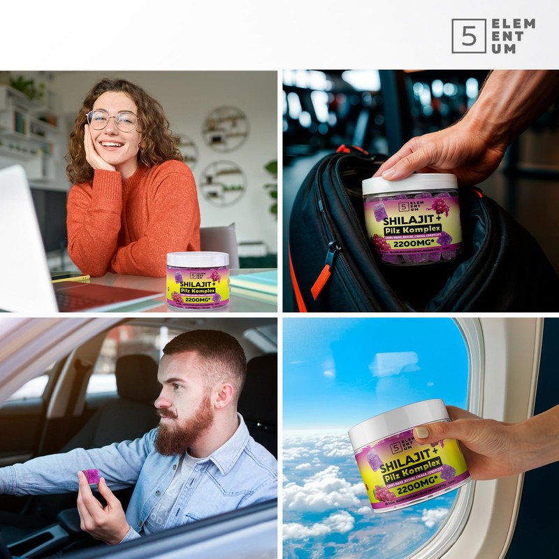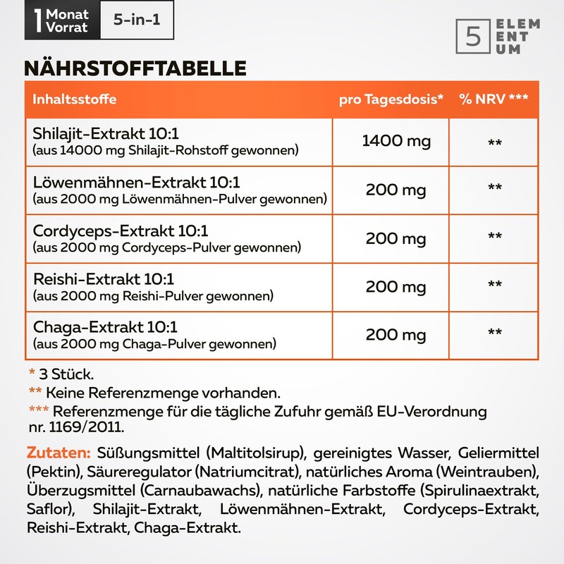5 elementum Original Shilajit Gummies 2200mg - 90 Stck Premium Shilajit Gummies mit L?wenm?hne, Reishi, Chaga & Cordyceps - Shilajit aus dem Himalaja fr Energie & Vitalit?t Mit dem Aroma von Traube