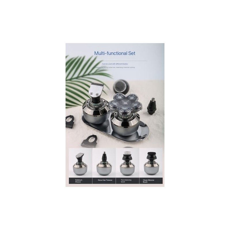 Transform your grooming routine with this versatile 5-in-1 electric shaver set. The innovative 6-blade head system ensures a precise, close shave while the multifunctional design adapts to all your grooming needs. This comprehensive set includes a main shaver unit, nose hair trimmer, face cleansing brush, and multiple attachments for customized grooming. The sleek gray design features a modern aesthetic with a comfortable grip. USB charging capability makes it convenient for both home use and travel. The set includes specialized attachments for sideburns, facial cleansing, and detailed trimming work. The rotary blade system is engineered for efficiency and comfort, while the included cleaning brush helps maintain peak performance. Perfect for daily grooming, this all-in-one solution eliminates the need for multiple devices. The ergonomic design and premium finish make this shaver set a sophisticated addition to any bathroom counter. Suitable for wet or dry use, it provides the flexibility to achieve your desired look whether you're maintaining facial hair or going for a clean-shaven appearance.