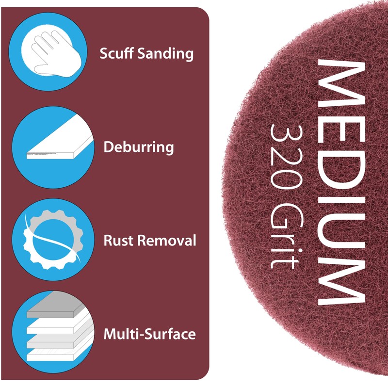 Durable & Versatile: Crafted from high-quality synthetic fibers for long-lasting performance. Use freehand or attach to 5” random orbit sanders/polishers with hook and loop backing. Premium Quality: 5” round, hook and loop backed maroon scuffing pads deliver a fine aluminum oxide abrasive cut, comparable to fine grit 320 grit sandpaper.