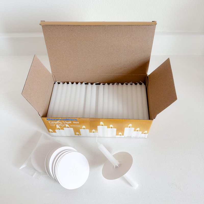 - Pack Contains: 100 white 5" vigil candles per box and 100 package of paper Bobeche / drip protectors to prevent wax dripping or spilling.