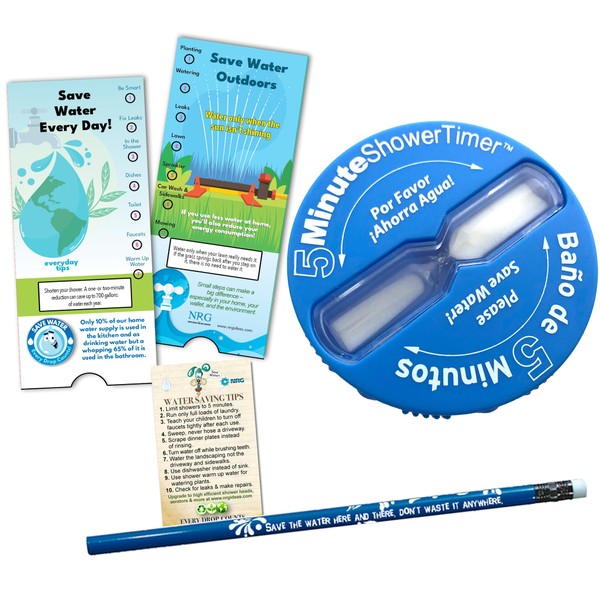 Save water and money with this handy Spanish-English shower timer. It's a simple and effective tool to help you shorten your showers, reduce water usage and save money. When the sand runs out, it's time to get out! All you do is place the suction cup on any non-porous surface and then swivel the timer every time you take a shower. Time approximately = five minutes per turn. Color may vary. Our shorter shower sand timer helps you beat the clock and save! Simply turn the timer on its suction cup backing to know when five minutes are up. Save water and save money with this handy and durable conservation device. Perfect for getting into the habit of a quicker and more efficient shower. Blue housing standard with sand timer and shatter-proof plastic cover.