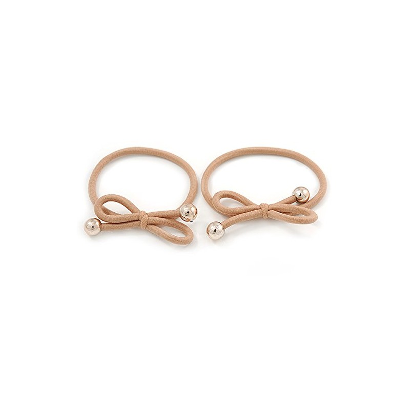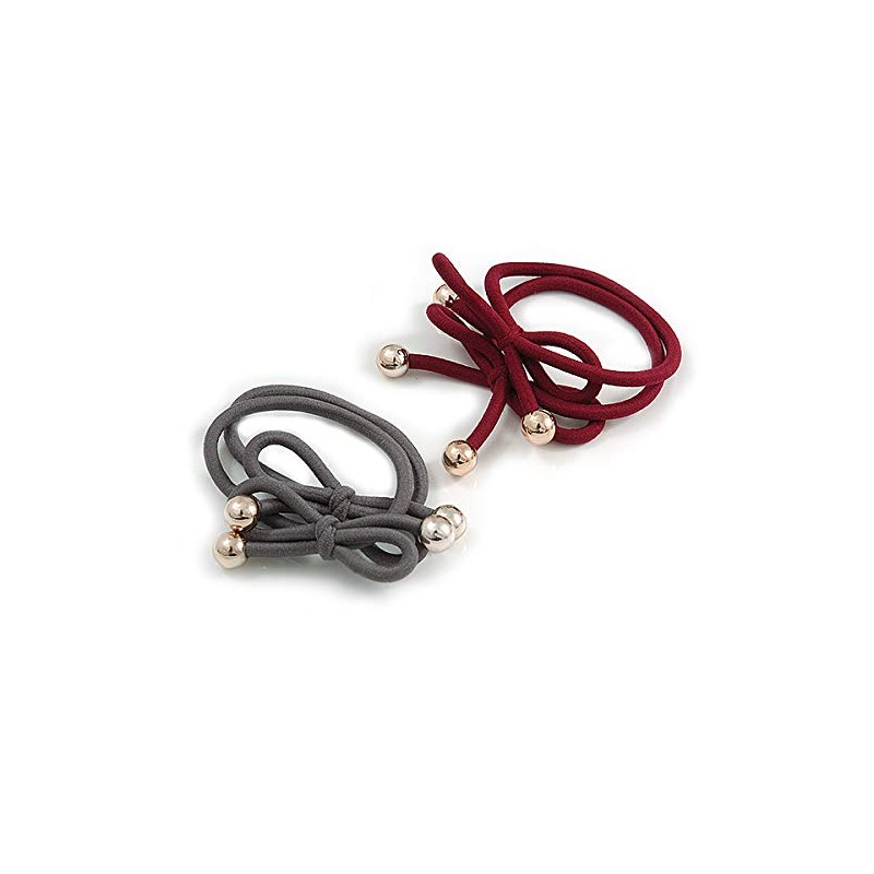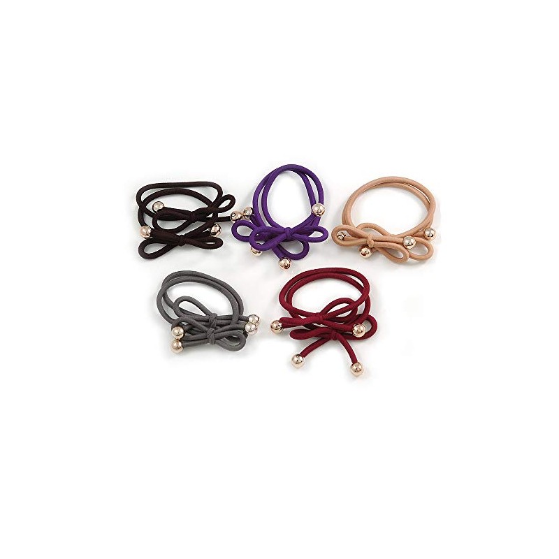 Set of 5 hair elastics in purple/ beige/ burgundy/ grey/ brown. Set includes 2 pcs of each colour thick elastics decorated with a bow motif and two gold tone plastic beads. Suitable for all hair types. A great basic for your hair wardrobe, ideal for school.