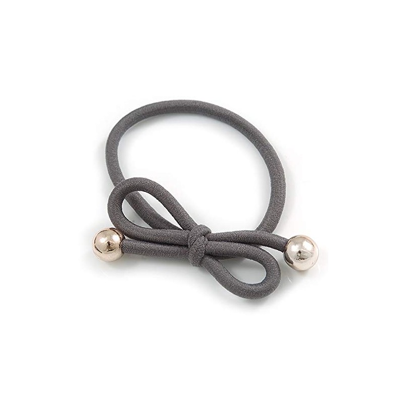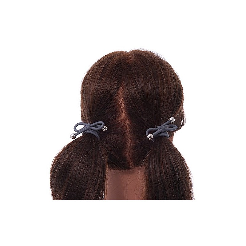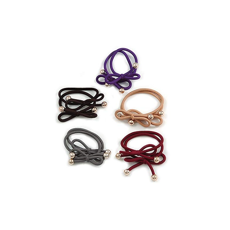 Set of 5 hair elastics in purple/ beige/ burgundy/ grey/ brown. Set includes 2 pcs of each colour thick elastics decorated with a bow motif and two gold tone plastic beads. Suitable for all hair types. A great basic for your hair wardrobe, ideal for school.
