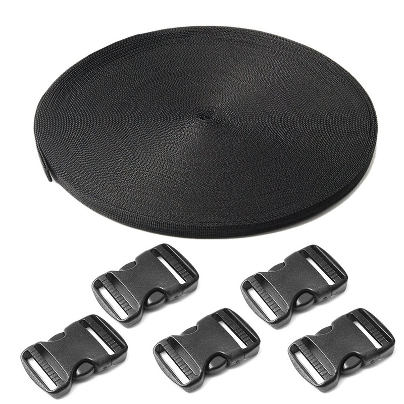 - Package includes:a roll of 5 yard in length 3/4 inch width polypropylene webbing and 5 pcs 3/4 inch flat side plastic release buckles.