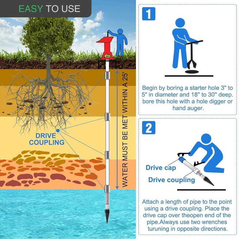 - 【Heavy-Duty Galvanized Steel】 Crafted from high-strength, galvanized steel for maximum durability. Built to withstand heavy pounding when driving the well point into the ground. Corrosion-resistant finish ensures long-lasting performance in harsh environments.