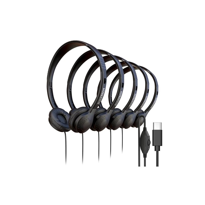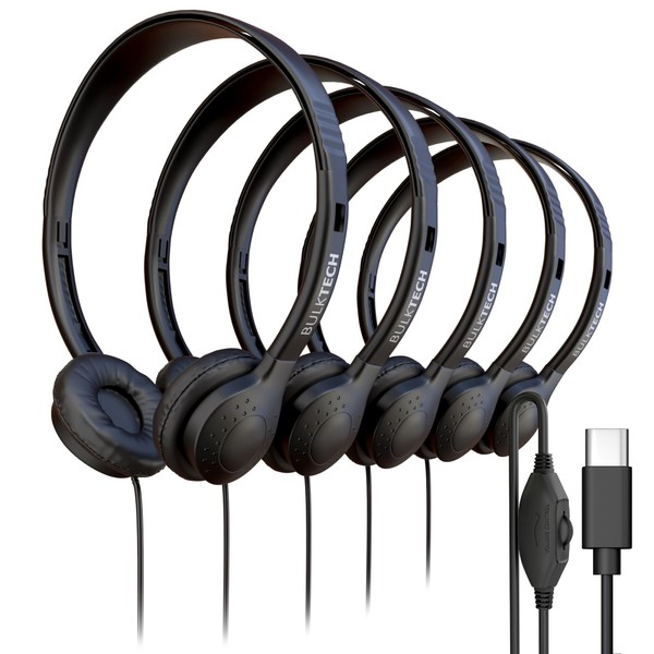 - 5 pack wired on-ear USB-C headphones, bulk set in black, each with soft leather ear cushions, adjustable headband, rotatable earcups, and built-in volume control for all-day comfort and easy sound adjustment