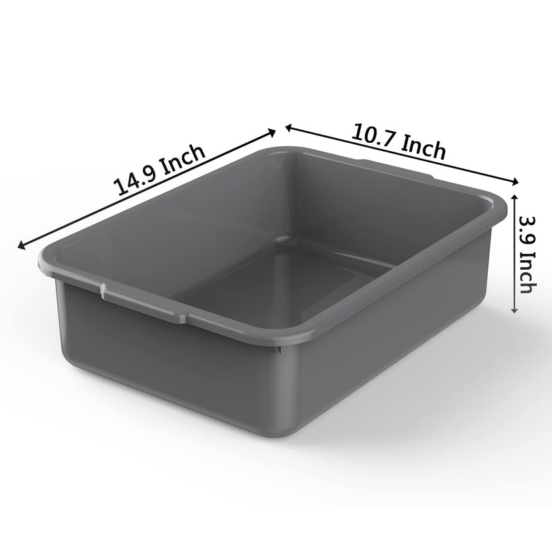- 5 pack grey commercial plastic bus bathtub box: size 14.89 inch x 10.72 inch x 3.9 inch, capacity is 8L. Its size and capacity meet the needs of most families.