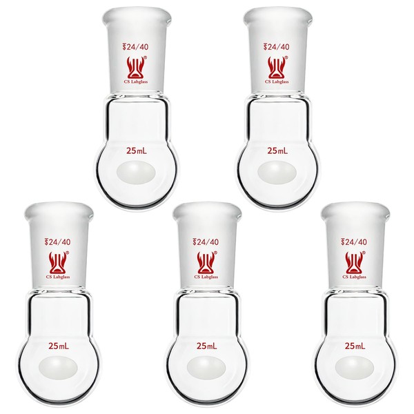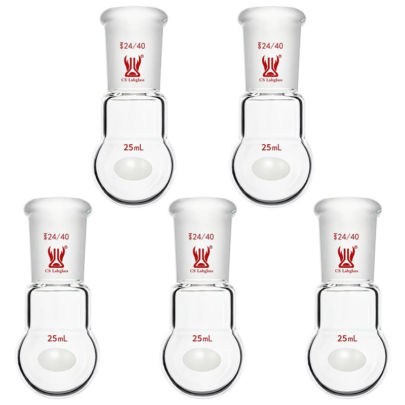 [5 Pack] CS Labglass 25ml Single Neck Round Bottom Flask with 24/40 Standard Taper Outer Joint, Borosilicate Glass Boiling Flask, Lab Glassware