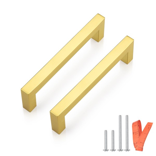 5 Pack Probrico Square Gold Kitchen Cabinet Pulls 5 Inch Stainless Steel Brushed Brass Cabinet Handles Square Corner Bar Polished Gold Dresser Drawer Pull Handles Total Length 5.5 Inch