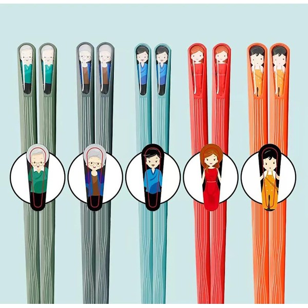 - 【Easy to Classify and Hygiene】Each pair of chopsticks has different color and been topped with different family member portrait( grandpa, grandma, dad, mom, child ). So each family member can choose their own representative pattern. These chopsticks are perfect for family-style dining, allowing each member to have their designated chopsticks for hygiene and convenience.