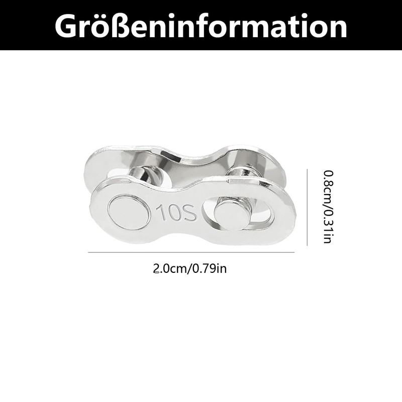 5 Pairs 10 Speed Chain Lock - Bicycle Chain Lock & Chain Links for 6/7/8/9/10 Speed Bike Chain This 5 Pair Chain Lock 10 Speed Set is the ideal solution for all cyclists looking for a reliable, easy to install bicycle chain lock. Compatible with 6, 7, 8, 9 and 10 speed bicycle chains, the high-quality chain locks are perfect for road bikes, mountain bikes, city bikes and e-bikes. Whether as a replacement for worn chain links bicycle, for quick repair on the go or for mounting a new bike chain, this practical set of 5 pairs of quick fasteners offers you maximum flexibility and safety when riveting bicycle chains and closing the chain. Rely on a stable, secure connection - with these universal bicycle chain locks for your bike chain.