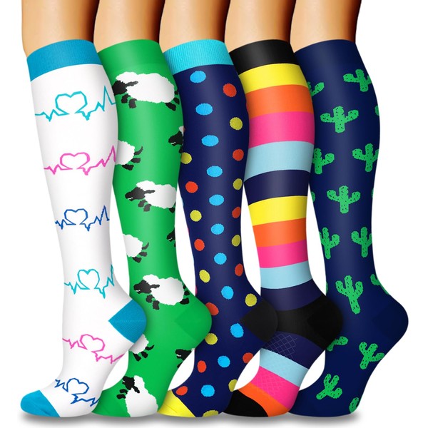 5 Pairs Compression Socks for Women & Men Circulation Support Knee High Stockings (01 Green/White/Blue/Sheep 1, Small-Medium)