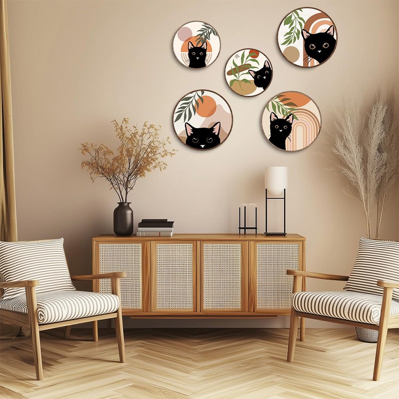 5 PCS Cat Wall Art Decor, Boho Geometric Hanging Wooden Wall Decor, Mid Century Bohemian Abstract Moon and Sun Wood Sign, Farmhouse Kitchen Bathroom Living Room Decorations, Cat Lover Gifts