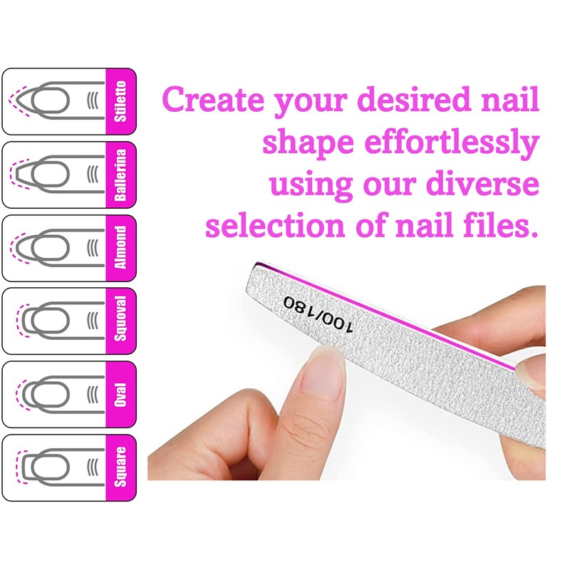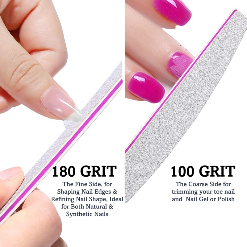 - Double-sided Nail File with 100/180 Grit - Our nail files feature a double-sided design. The 100 Grit side is coarse, making it suitable for use on toenails and helping to remove nail gel. The 180 Grit side is fine and ideal for trimming nail edges and refining shapes, whether you have natural or acrylic nails. These files are washable and can be easily rinsed with antibacterial soap and disinfectant.
