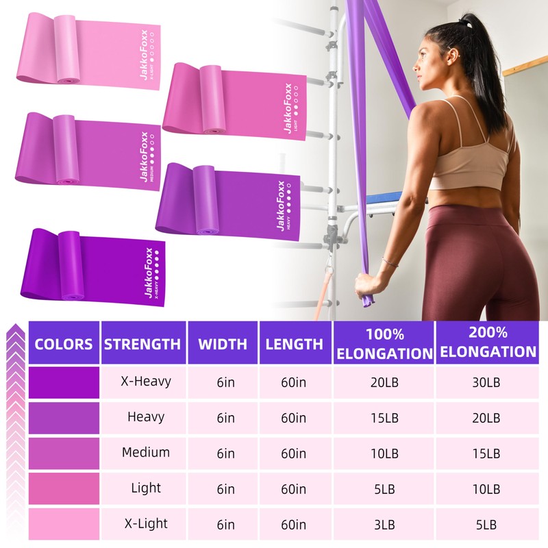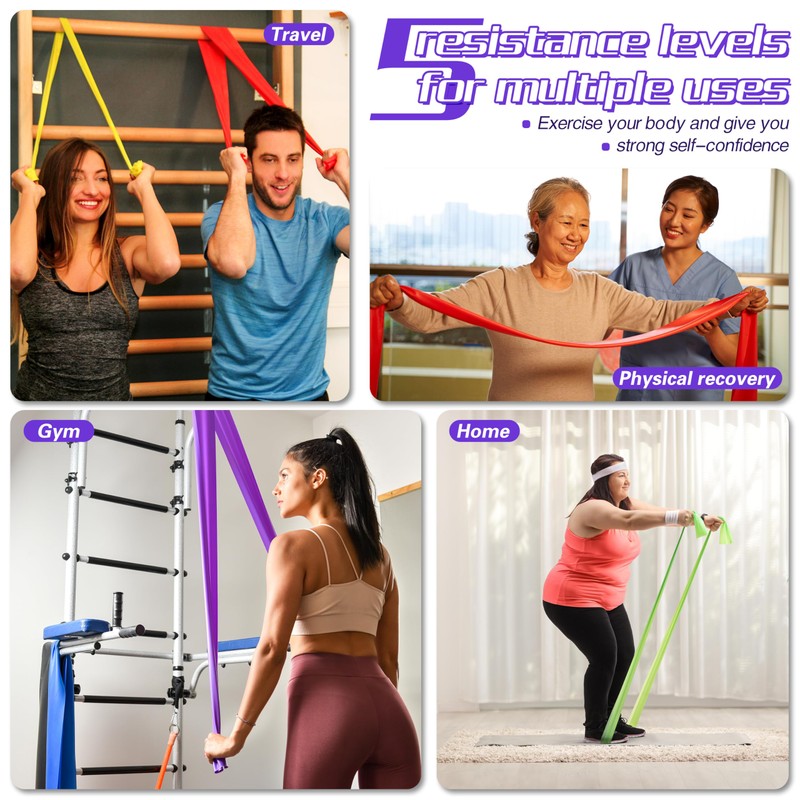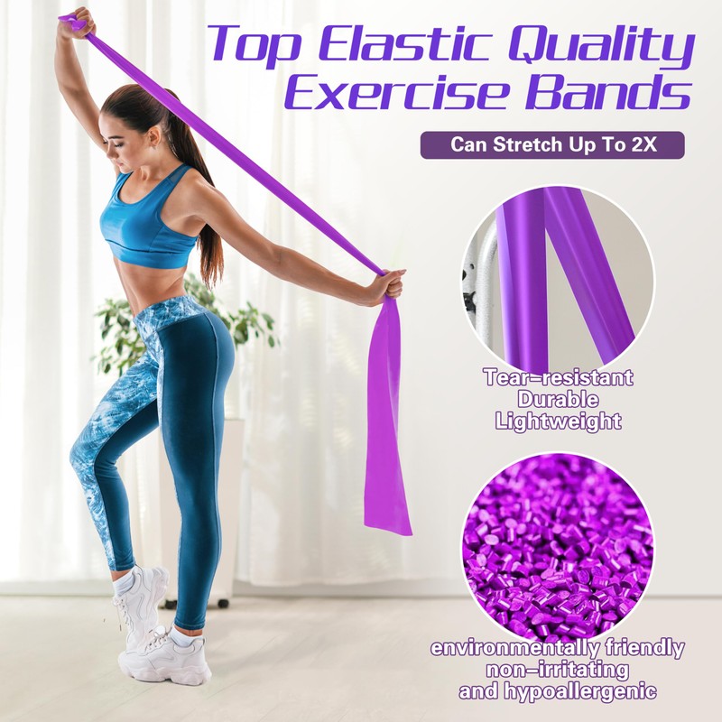 - High end Resistance Bands: Stretch bands is 59 inches(4.9FT) long and 6 inches wide , This makes them perfect whether you are just starting to workout or a seasoned workout warrior. Our extra light and light bands are great for beginners, while our medium, heavy and extra heavy exercise bands are targeted for more intermediate and advanced strength training.latex-free,