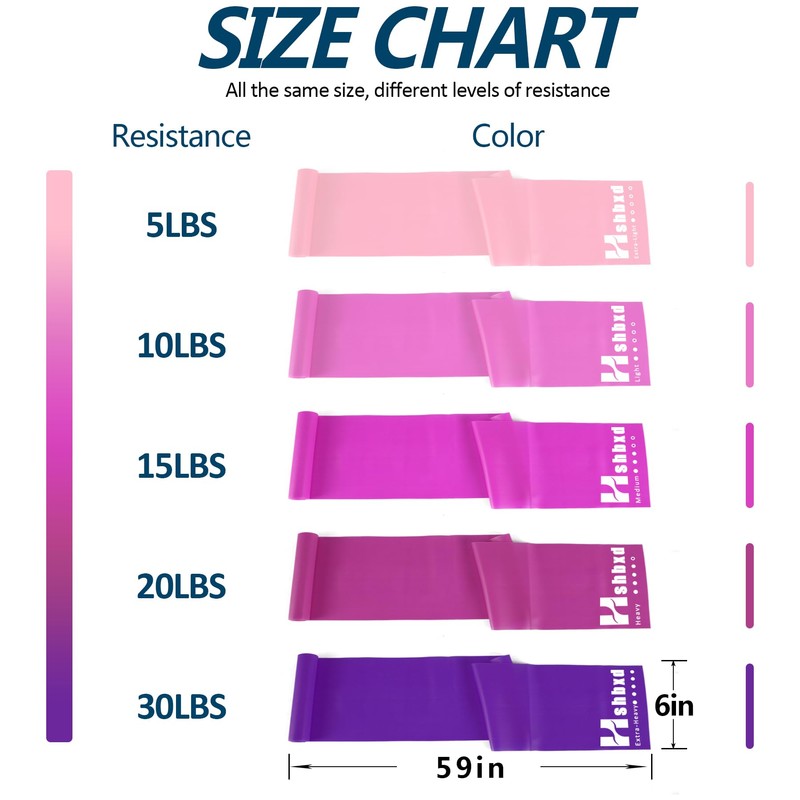 - 5 Levels Of Resistance - 5 resistance bands are 59in (150cm) long and 5.9in (15cm) wide, the resistance bands is yellow band (5 lbs), red band (10 lbs), green band (15 lbs), blue strap (20 lbs), gray strap (30 lbs).