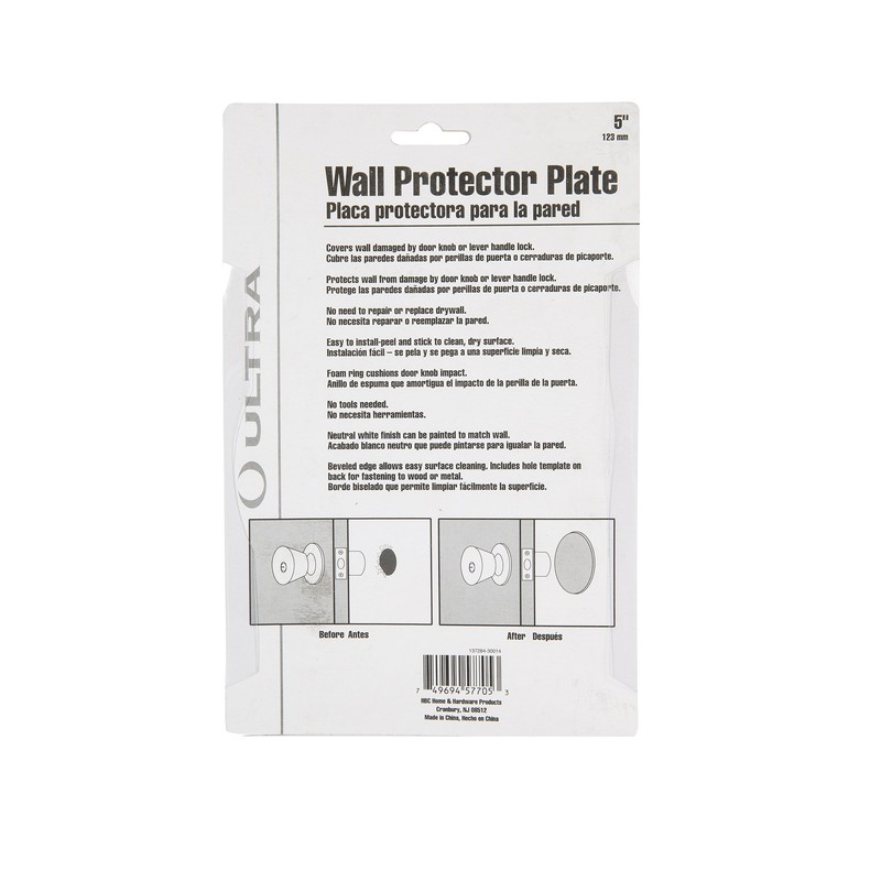 - SPECIFICATIONS - Includes (1) 5” Ultra Hardware Wall Protector Plate, White. Includes hole template on back for fastening to wood or metal. Foam rings cushion door impact. No tools required.