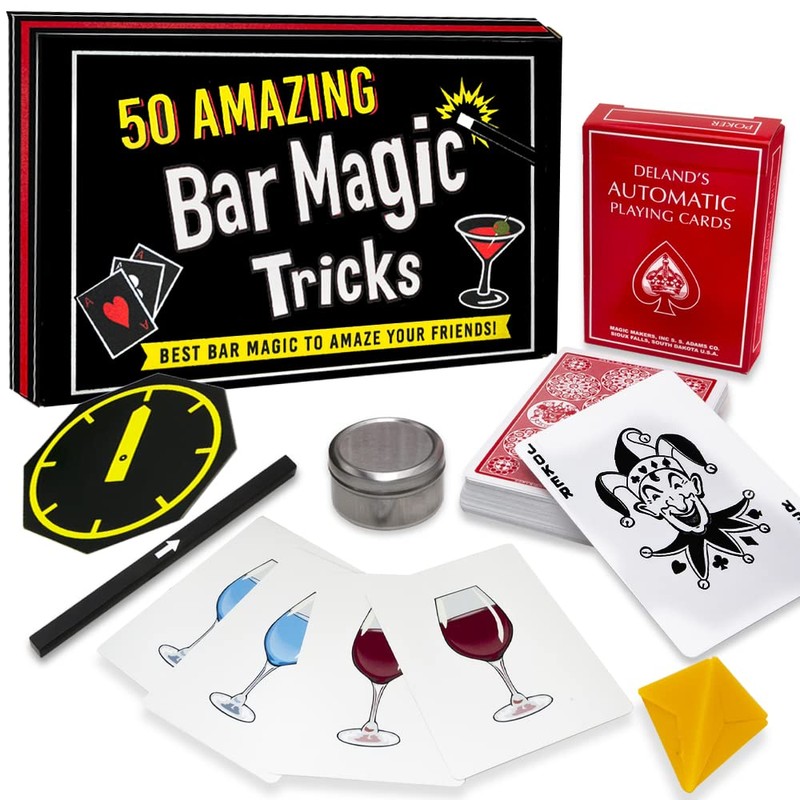 - BAR TRICKS TO AMAZE: Amazing Bar Magic Tricks is a happy hour of incredible magic tricks, bar bets and stunts. This kit features many scary-good tricks, we have included the BEST of the BEST magic tricks, including the Secret Box, Deland’s Automatic Deck, Magic Arrow Stick, Water to Wine Card Packet Trick, the Great Pyramid Puzzle, Magic Compass and so much more