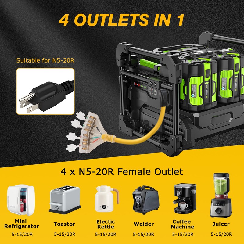 • PRODUCT SPECIFICATIONS: 50 amp to 110 adapter, 4 prong NEMA 14-50P Male Plug to 4X 5-15/20 amp T-Blade household Connectors, UL Listed