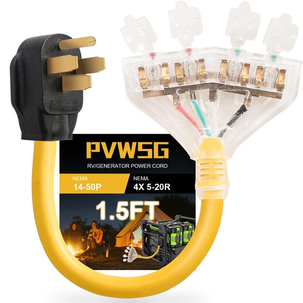 50 Amp to 20 Amp Adapter, 110 Generator RV Distribution NEMA 14-50P Male to 4X 5-15R/5-20R Female with Lighted End and Dust Protection Caps, 1.5 FT
