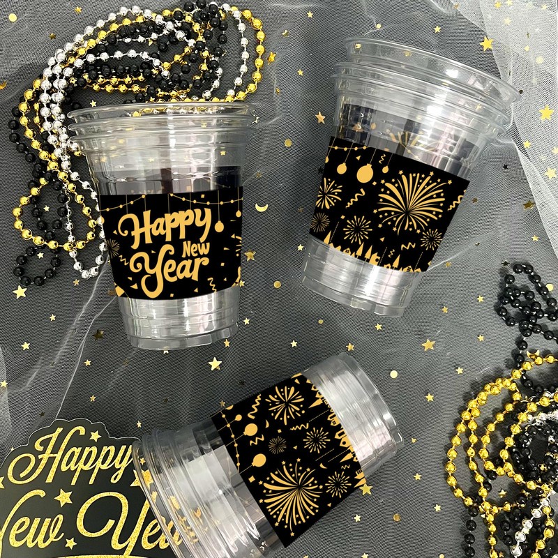 - New Year Themed Design: These Happy New Year party plastic cups are printed with clear and eye-catching graphics such as celebratory champagne flutes, balloons, and the word Happy New Year, creating a strong New Year's festive atmosphere for your party event
