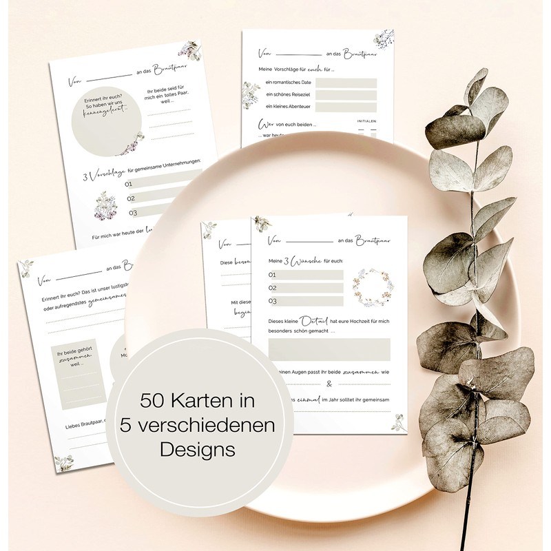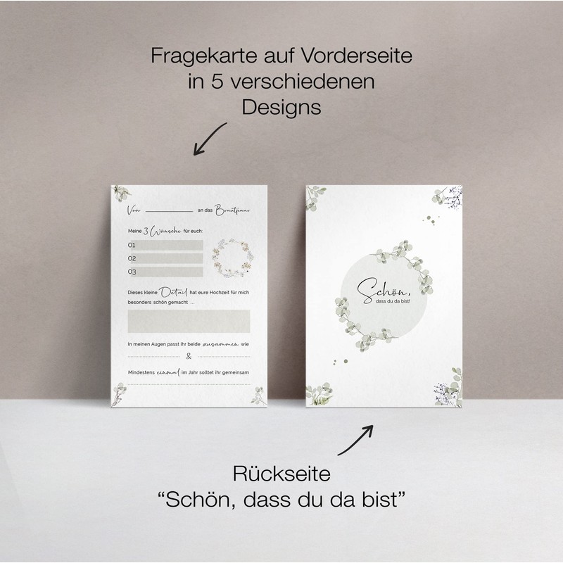 50 Gästebuch Karten für die Hochzeit mit Box | 5 verschiedene Designs | DIN A6 Postkartengröße | für alle Paare | Greenery & Eukalyptus Look