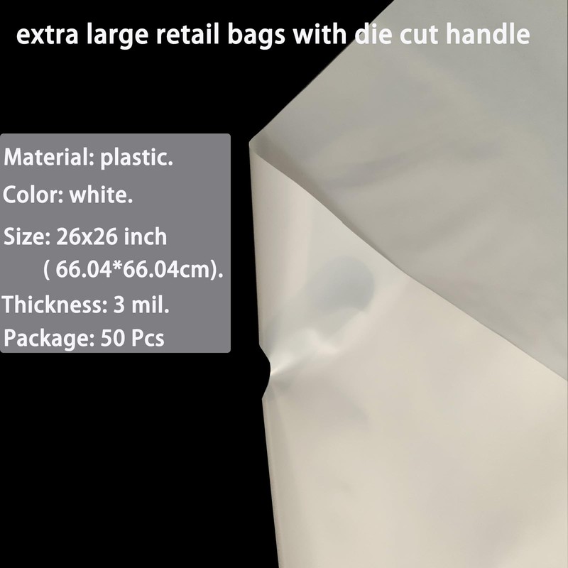 - Bulk White Plastic Shopping Bags: Includes 50 pcs 26x26 inches- 3 mil thick extra large white shopping bags with die cut handles, no gusset.