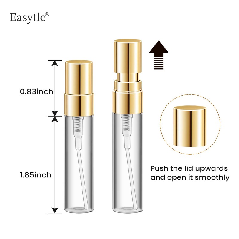 - Premium Quality: The refillable empty perfume spray bottles are made of high impact glass, sturdy, durable, wear-resistant and smooth surface, so these perfume bottles are refillable and reusable. The empty travel sample bottle with the utilization of high precision nozzle, the mist spray is delicate and even, will not clogged up nor gets stuck easily. The spring of mist spray bottle is long enough, which is convenient for pressing out sufficient liquid.