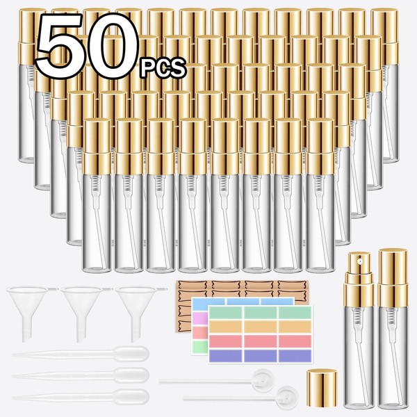 50 Pack Glass Mist Spray Bottle 5ml Clear Mini Refillable Perfume Bottles Empty Travel Sample Bottle Fine Mist Perfume Atomizer Perfume Spray Containers (88 Label, 10 Funnel, 10 Dropper, 10 Dispenser)