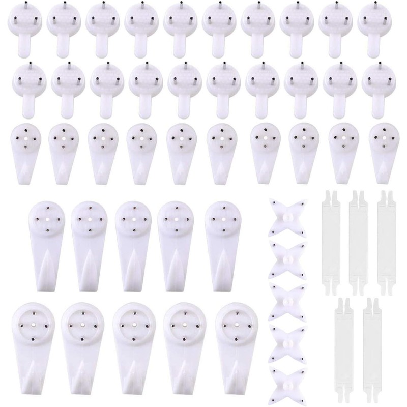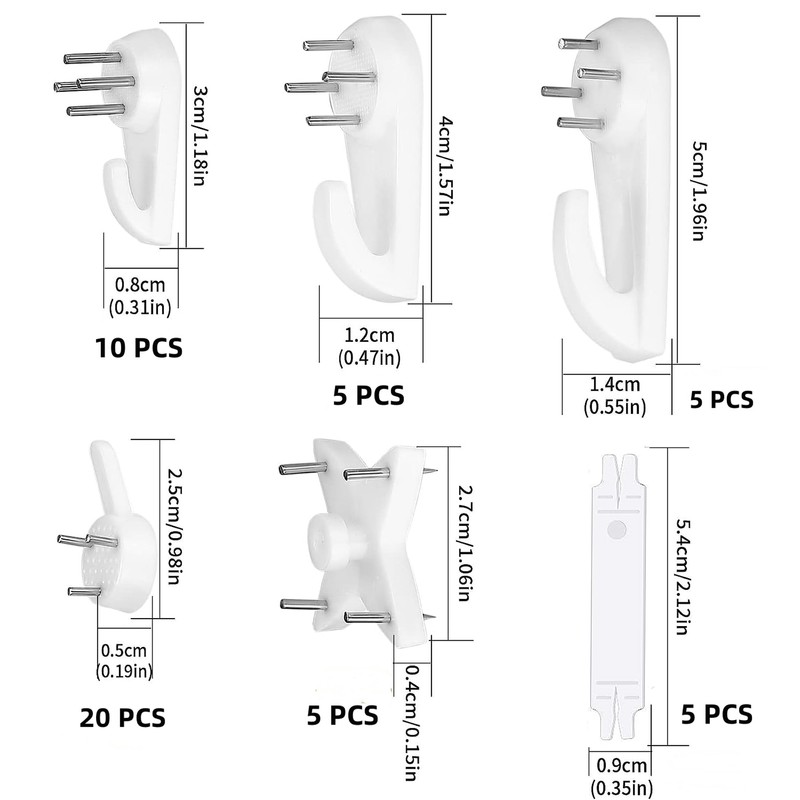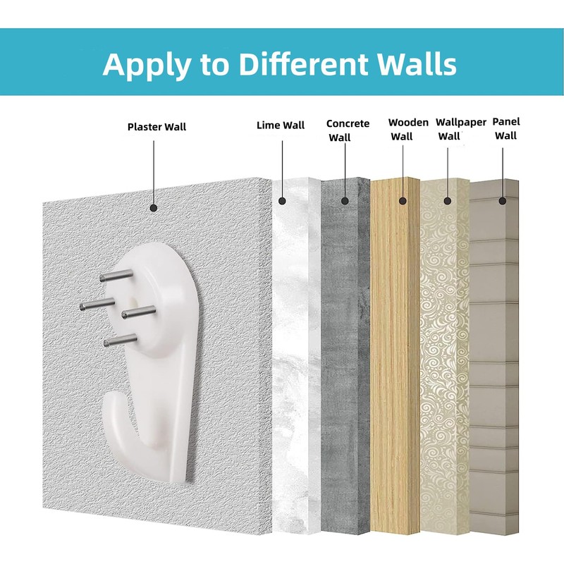 - Removable Hardwall Picture Hanging Hooks: heavy duty picture hooks made of high-quality ABS material, which has higher hardness, toughness and stronger than other PP plastic hooks on the market. The non-mark picture hooks can hang items up to 35 lbs.