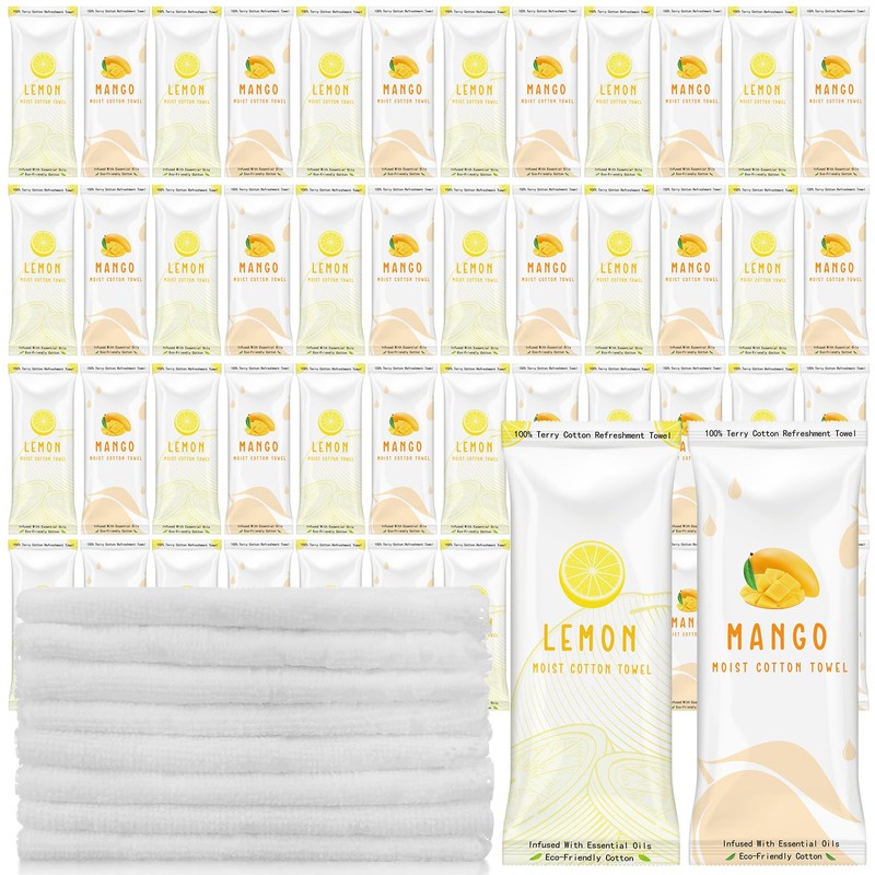 50 Pcs Moist Towelettes Individually Wrapped Scented Disposable Face Towels Essential Oil Infused Moist Terry Cotton Towel for Use Hot or Cold Travel Body Spa (Lemon Mango)