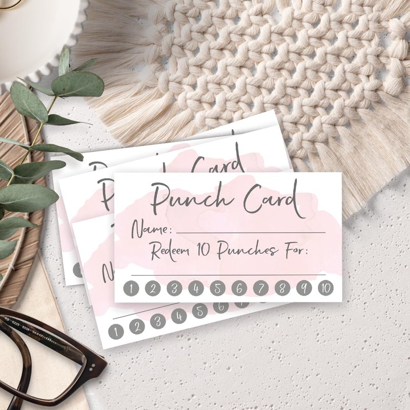 These reward punch cards can be used for a variety of customer loyalty programs. Perfect for small businesses such as Boutiques, Hair Salons, Stylists, Spas, Photographers, and more. Thank you with pink watercolor design on back side of cards. Cards measure 3.5” x 2” (Standard Business Card Size) - Printed on Heavy Weight Card Stock. Punch out numbers with any hole punch or simply cross out numbers.