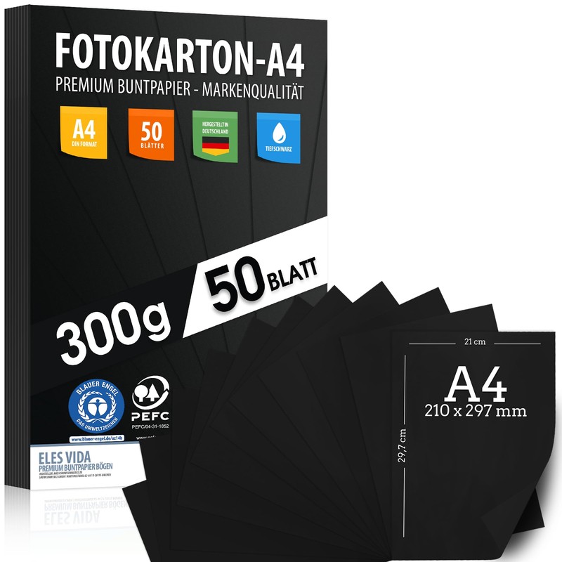 50 Sheets Black Craft Card 300 g/m² - Premium Paper Jet Black - DIN A4 - 21 x 29.7 cm - Photographers Black Blank for Photography, Presentations, Crafts, Photo Cardboard, Made in Germany